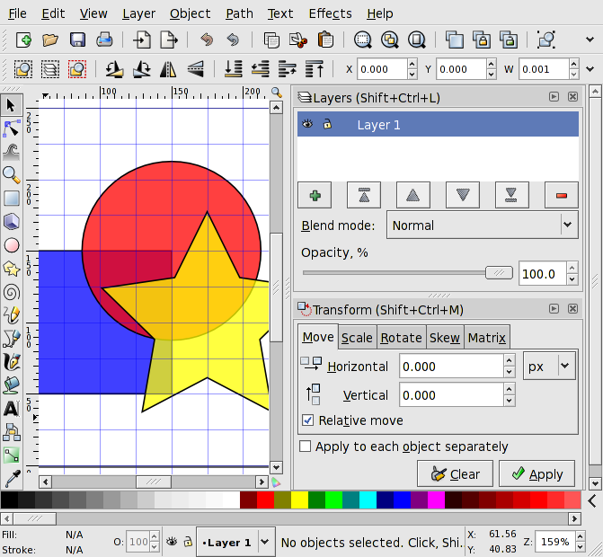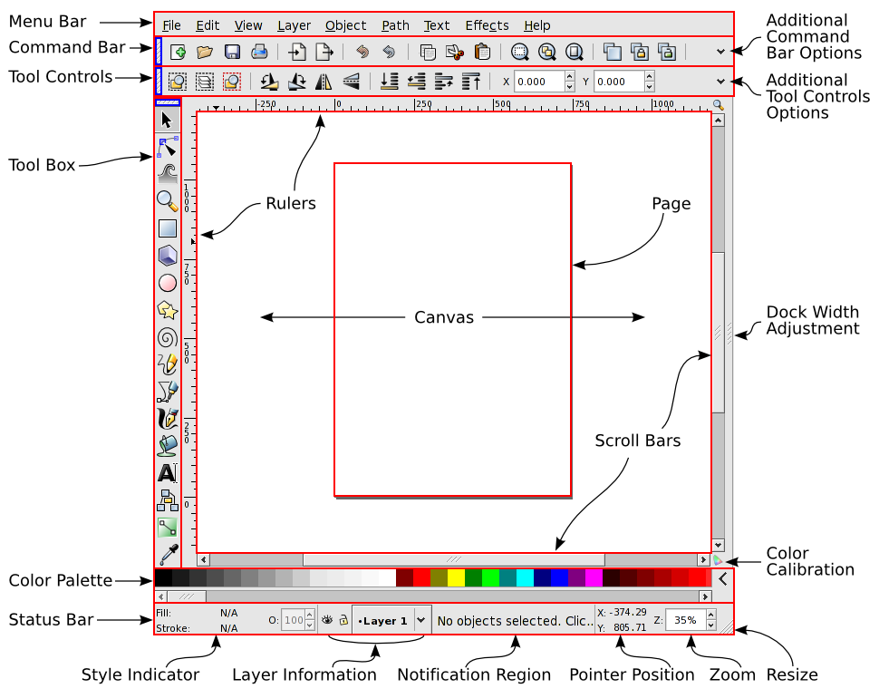 Start by opening Inkscape.[3] You will see a single window. This window contains several major areas, many containing clickable icons or pull-down menus. The following figure shows this window and labels key parts.