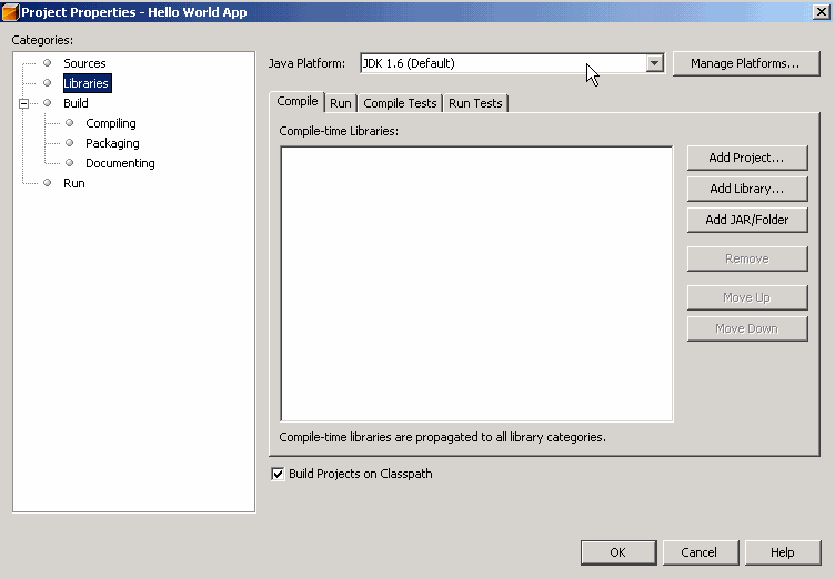 --jdkhomeswitch on the command line, or by entering the path to the JDK in thenetbeans_j2sdkhomeproperty of yourINSTALLATION_DIRECTORY/etc/netbeans.conffile.To specify this JDK for the current project only, select Hello World App in the Projects pane, choose File | "Hello World App" Properties, click on Libraries, then select JDK 6 under the Java Platform pulldown menu. You should see a screen similar to the following: