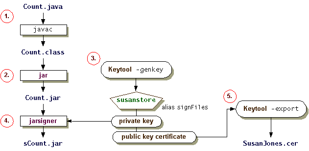 keytool-exportcommand. Then supply the signed JAR file and the certificate to the receiver Ray.These steps are shown in the following figure.
