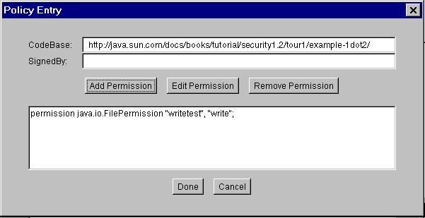 Click the image to view it at its natural size.You have now specified this policy entry, so click on the Done button in the Policy Entry dialog. The Policy Tool window now contains a line representing the policy entry, showing the