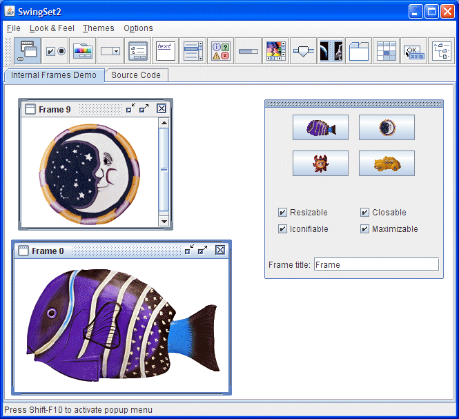 In your JDK 6 installation, there is ademo\jfcfolder that contains a demonstration program calledSwingSet2. This program has a graphically rich GUI and allows you to change the Look and Feel from the menu. Further, if you are using the Java (Metal) Look and Feel, you can choose a variety of different themes. The files for the various themes (for example,RubyTheme.java) are found in theSwingSet2\srcfolder.This is the "Ocean" theme, which is the default for the cross-platform Java (Metal) Look and Feel: