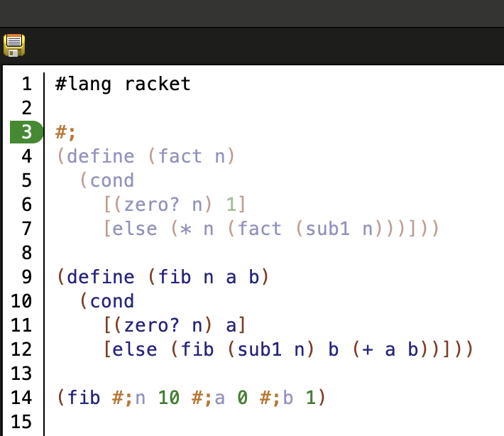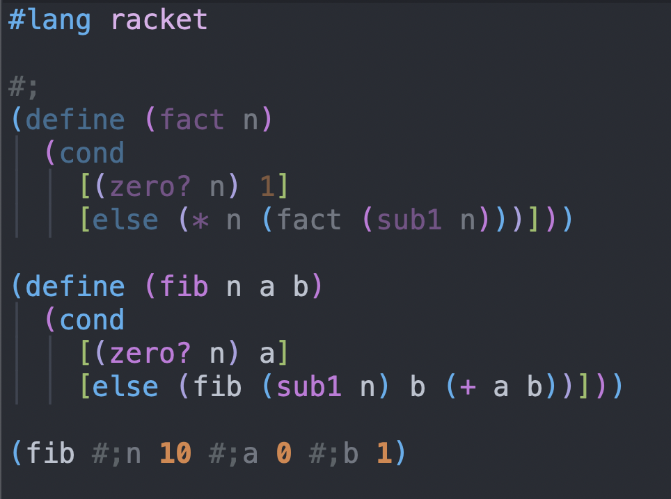 In addition to ;, we have two other mechanisms for commenting code: #|...|# for blocks and #; to comment out an expression. Block comments are for those rare cases when an entire block of definitions and/or expressions must be commented out at once. Expression comments#;apply to the following S-expression. This makes them a useful tool for debugging. They can even be composed in interesting ways with other comments, for example, #;#; will comment two expressions, and a line with just ;#; gives you a single-character “toggle” for the expression that starts on the next line.